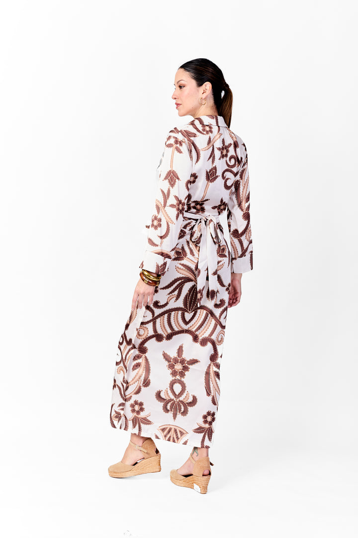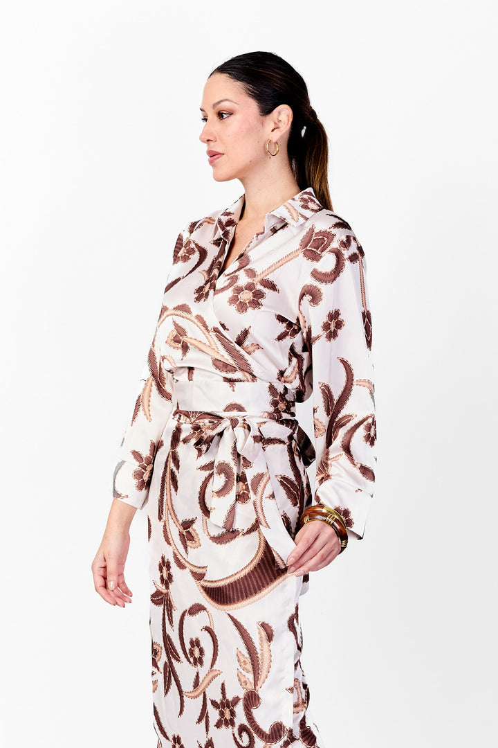 Set de top y falda de raso estampado con flores y hojas largas en tonos marrones. El top tipo camisa con cuello clásico se lleva abierto y amarrado con tiras largas al frente. Presenta mangas largas y anchas con puño de borde ancho, aportando un aire fluido y elegante.