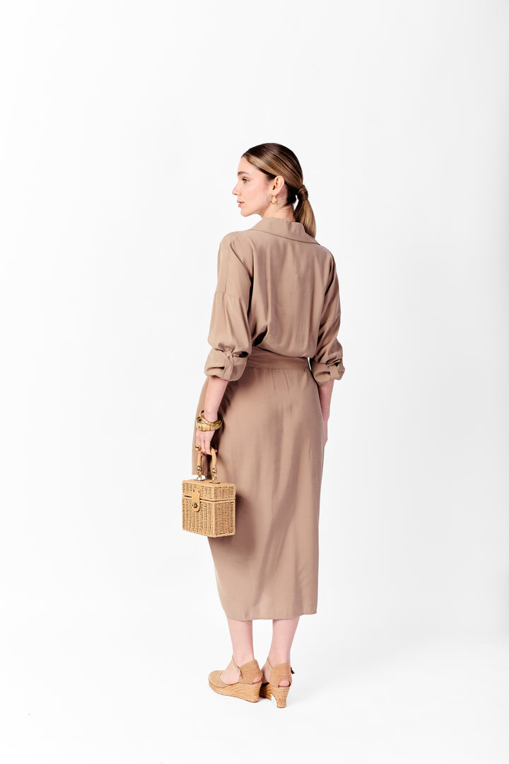 Vestido de algodón con cuello tipo camisa y abotonadura frontal de once botones. Presenta una falda recogida al frente con lazo cosido y mangas con puño recogido, logrando un estilo femenino y relajado.