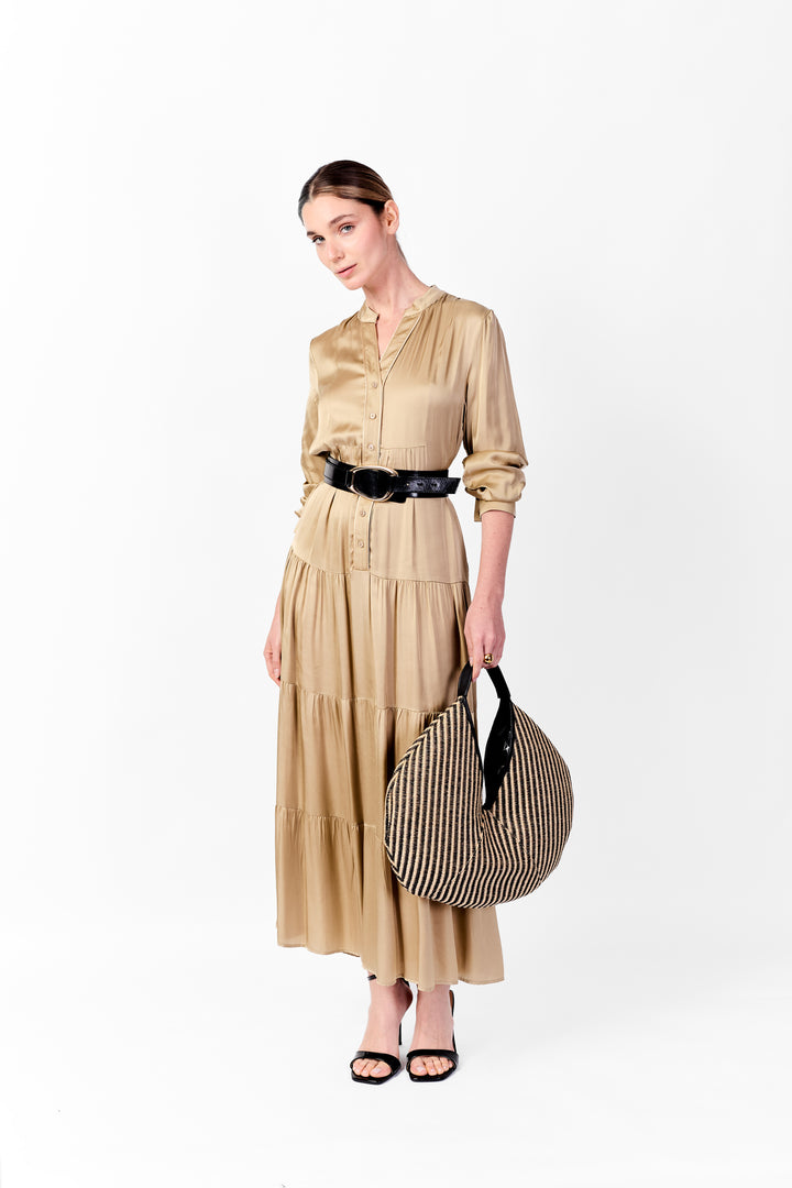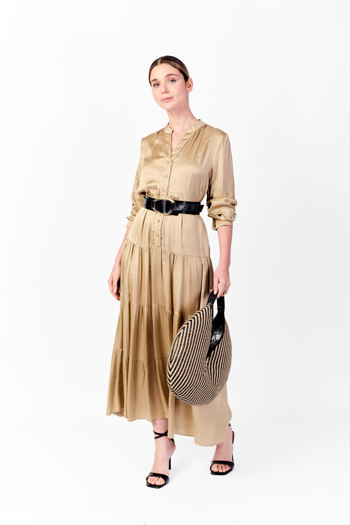 Vestido con cuello nerú y escote abierto con seis botones. Presenta bordes con dos venas decorativas y una falda de tres cortes en tiempos, que aporta movimiento y una caída ligera.