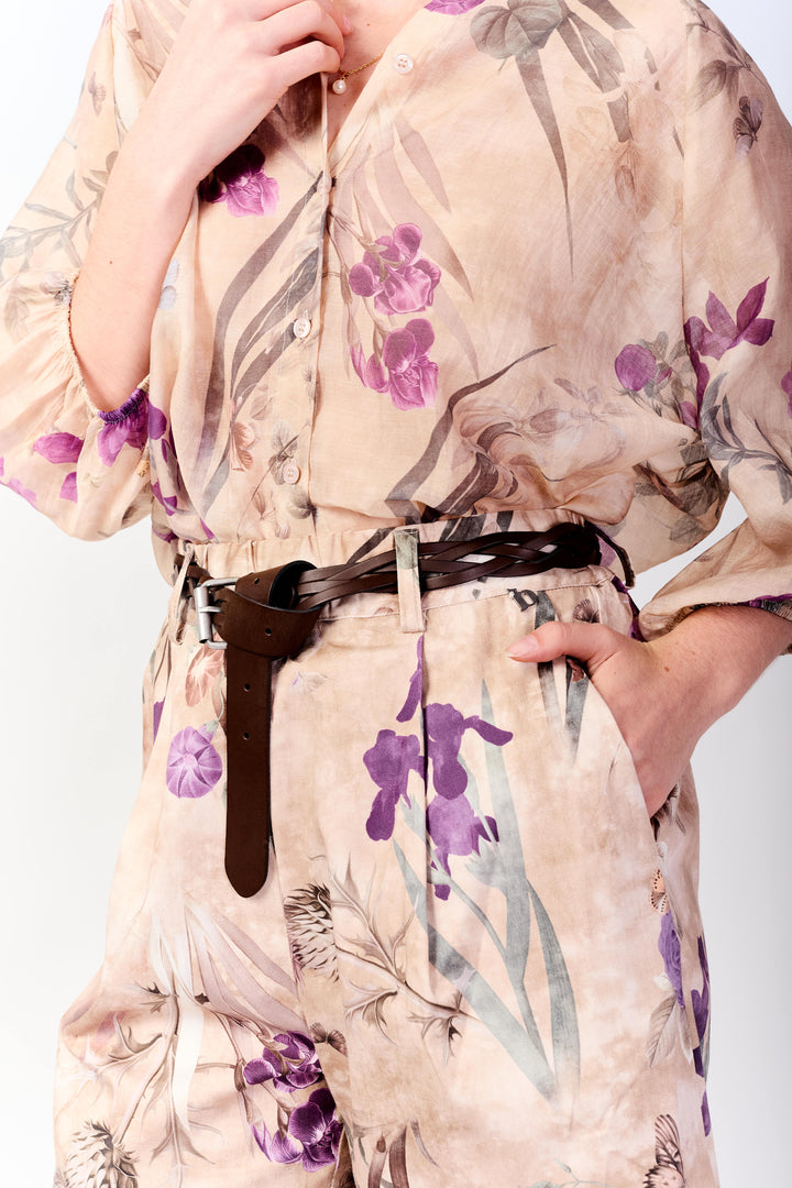 Short confeccionado en algodón suave con estampado de flores lilas y hojas verdes. Presenta una cintura ancha con cinco presillas y una correa trenzada marrón con hebilla cruzada, que aporta un...