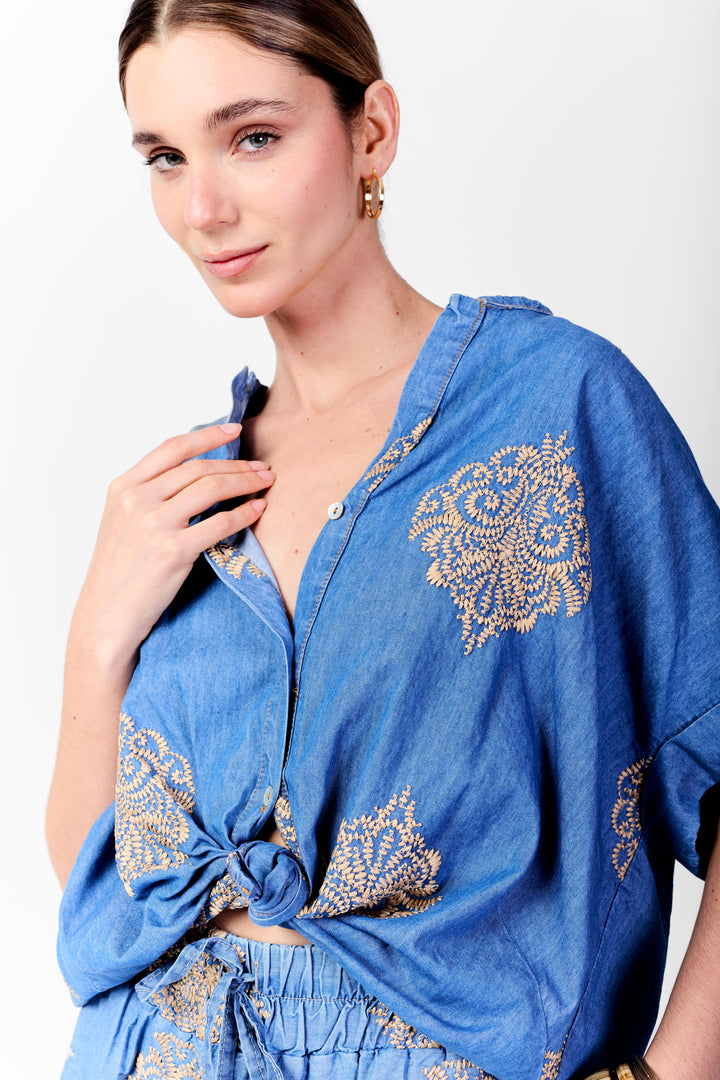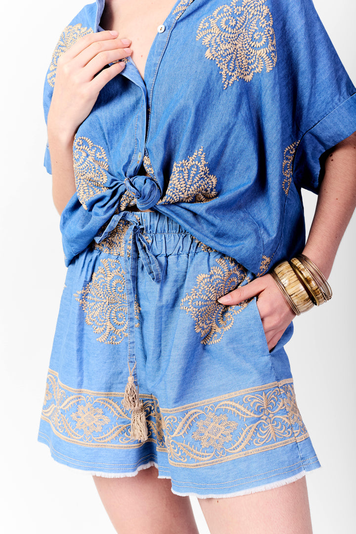 Conjunto confeccionado en algodón con delicados bordados de hilos beige y pespuntes en tono camel. El top se ajusta con cuatro botones tipo conchita y un lazo delantero, con mangas cortas de doblez relajado. Un diseño artesanal y fresco, ideal para los días de verano.