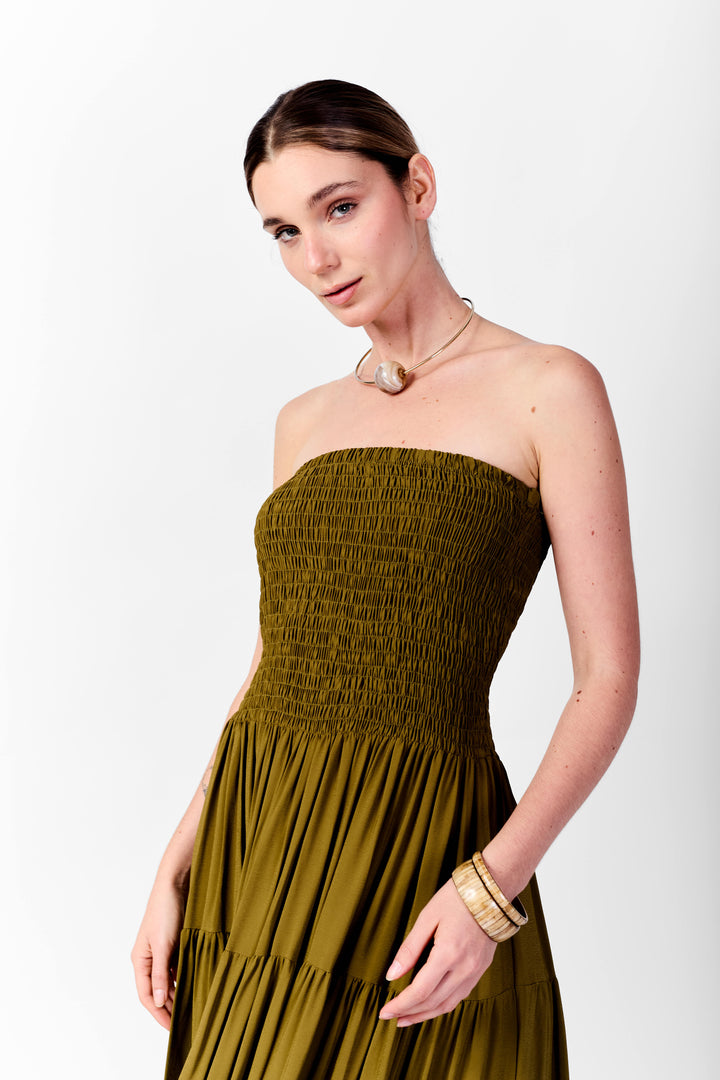 Vestido confeccionado en crepe ligero con cintura elástica delgada que realza la silueta. La parte superior está trabajada con tejido tipo panal de abejas, que aporta textura y ajuste. La falda presenta tres cortes con tiempos, creando una caída fluida y femenina.