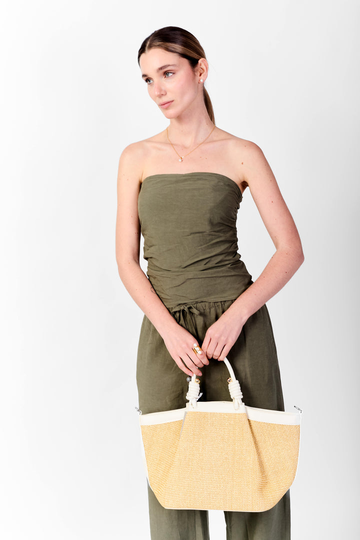 Conjunto de lino con acabado natural y fresco. El top strapless de escote recto presenta costados recogidos y espalda con tejido tipo panal de abejas, que aporta elasticidad y comodidad. El pantalón ancho tipo samurái cuenta con cintura elástica delgada, pasadores con detalles de bolitas de madera y bolsillos laterales escondidos. Un look ligero y artesanal, perfecto para el verano.