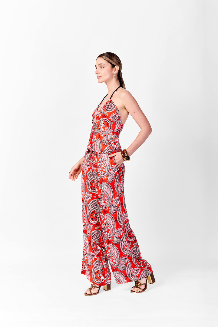 Conjunto con estampado de figuras paisley y orquídeas en tonos vino y rosado. El top de cuello halter con pasador grueso presenta un escote recogido de forma ovalada y una espalda descubierta con panel tipo panal de abejas ancho, que brinda elasticidad y ajuste. Una pieza femenina y ligera, ideal para un look veraniego con aire bohemio.