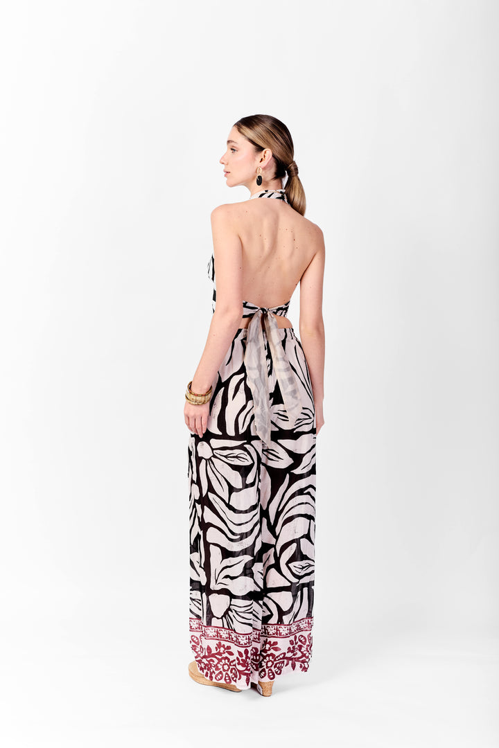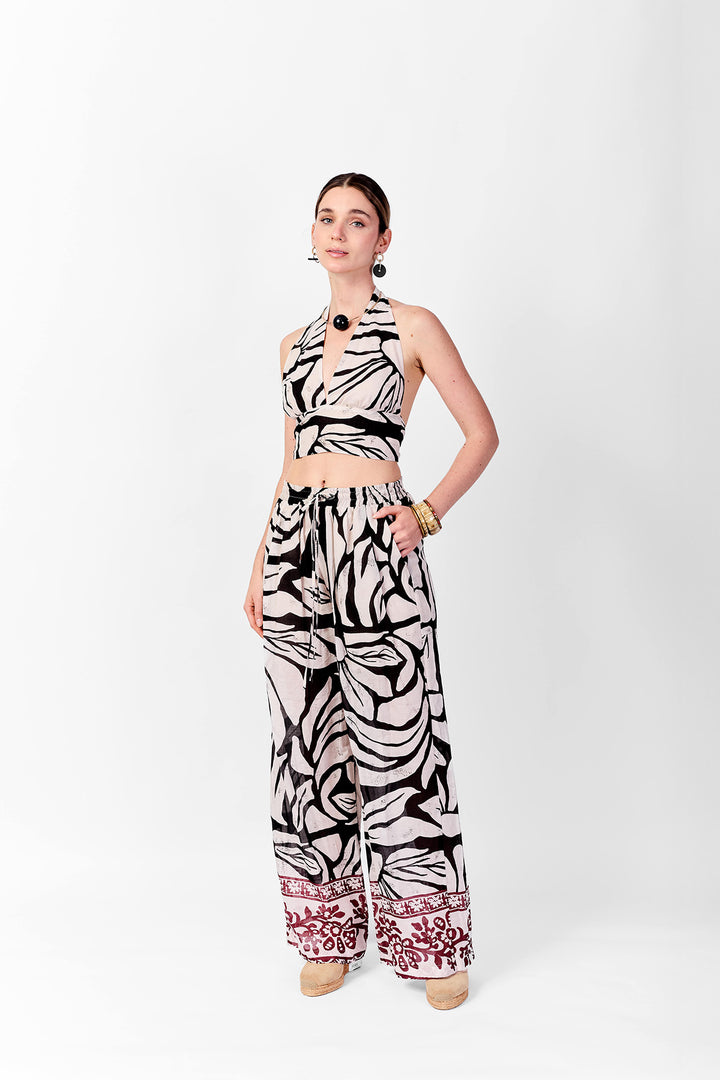 Conjunto con caída suave y fresca. El top de cuello halter deja la espalda descubierta y se ajusta con un lazo anudado atrás, aportando un toque femenino y relajado. Un diseño versátil...